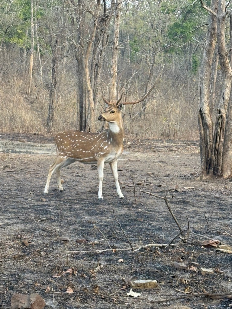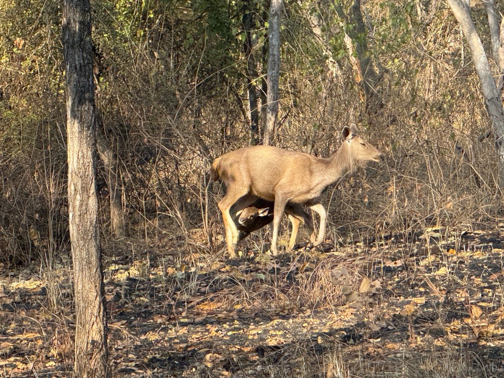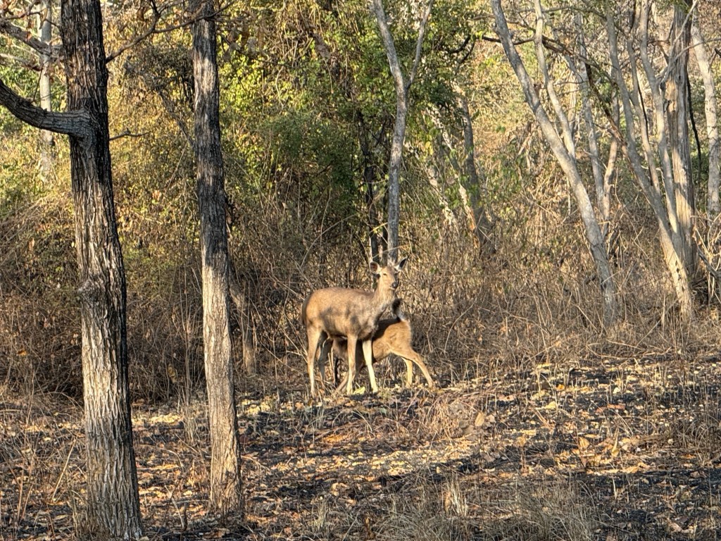 Many deer with impressive horns roam the vast wilderness, undeterred by the presence of a tame elephant in the park. The elephant’s size serves as a natural deterrent against tigers, making the park a haven for wildlife.