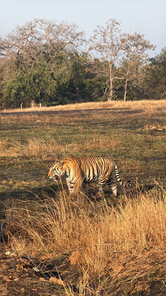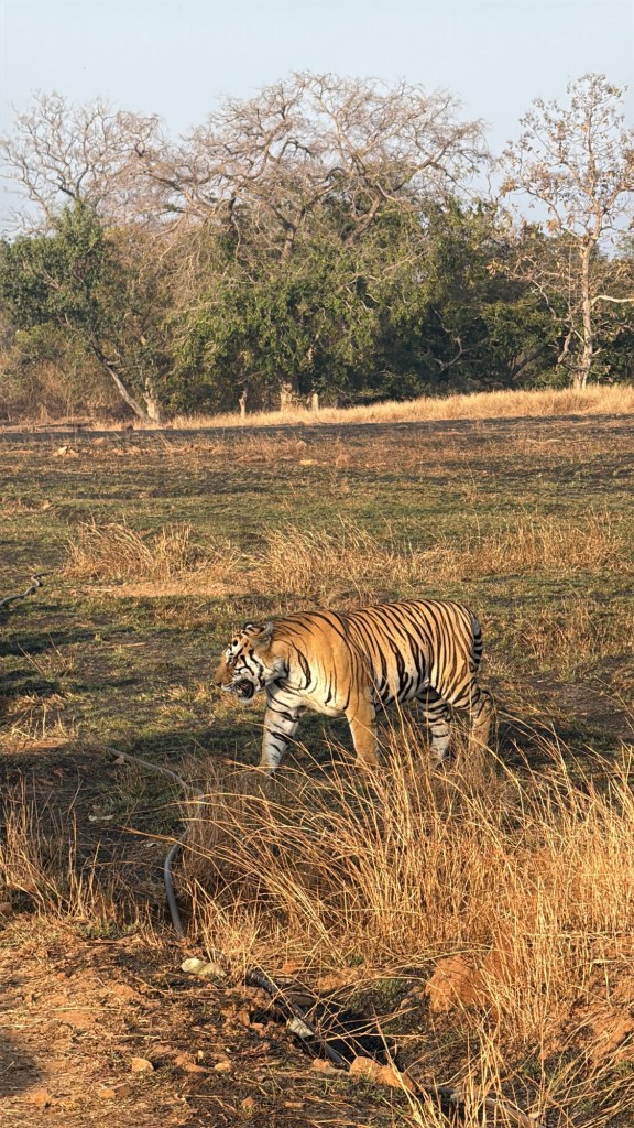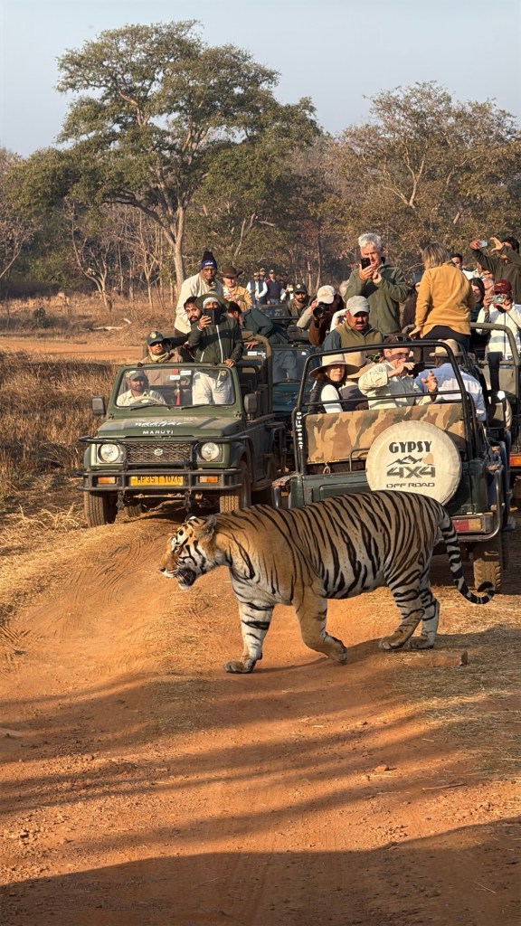 according to the guides, I think this was accurate this time, we were extremely fortunate maybe one of the best tiger sightings they have seen. this large mail hung around and even crossed the road in front of us apparently it almost never does that. The jeeps must’ve been just far enough apart.